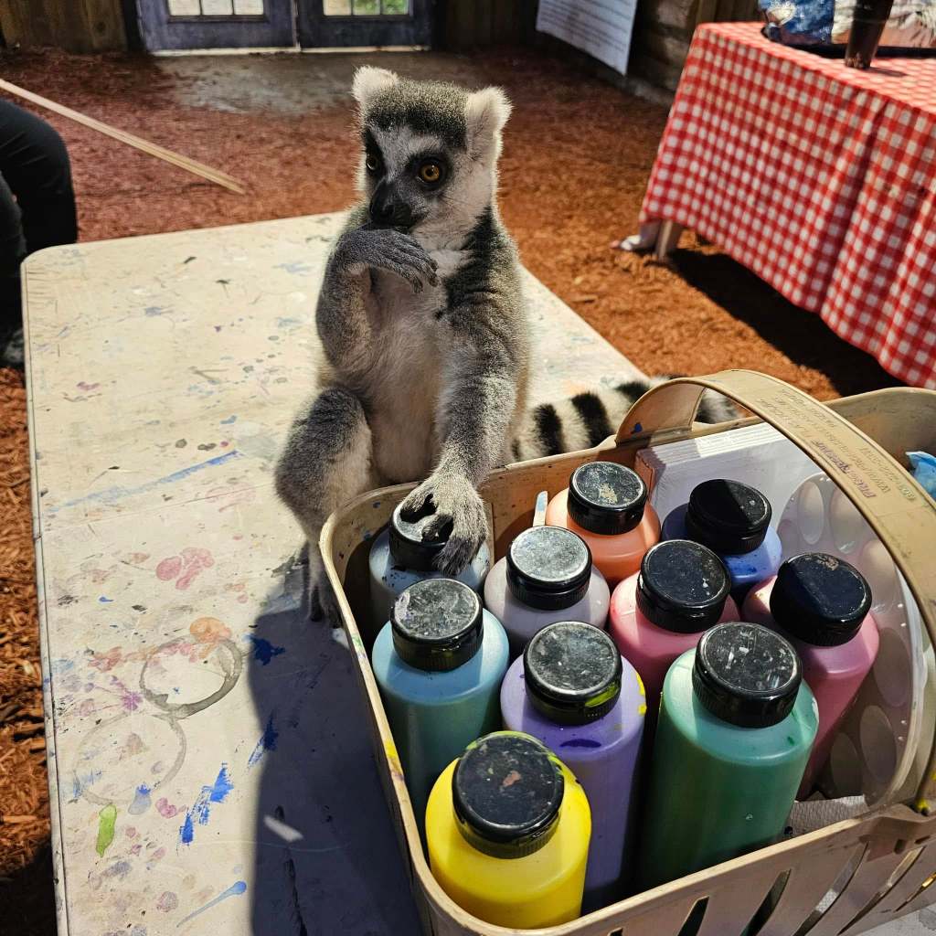 This was not your typical art class. The lemurs had full control of the room, swinging around and investigating our painting stations. Each participant received a canvas and some fruit to entice our fuzzy friends into “collaborating.”